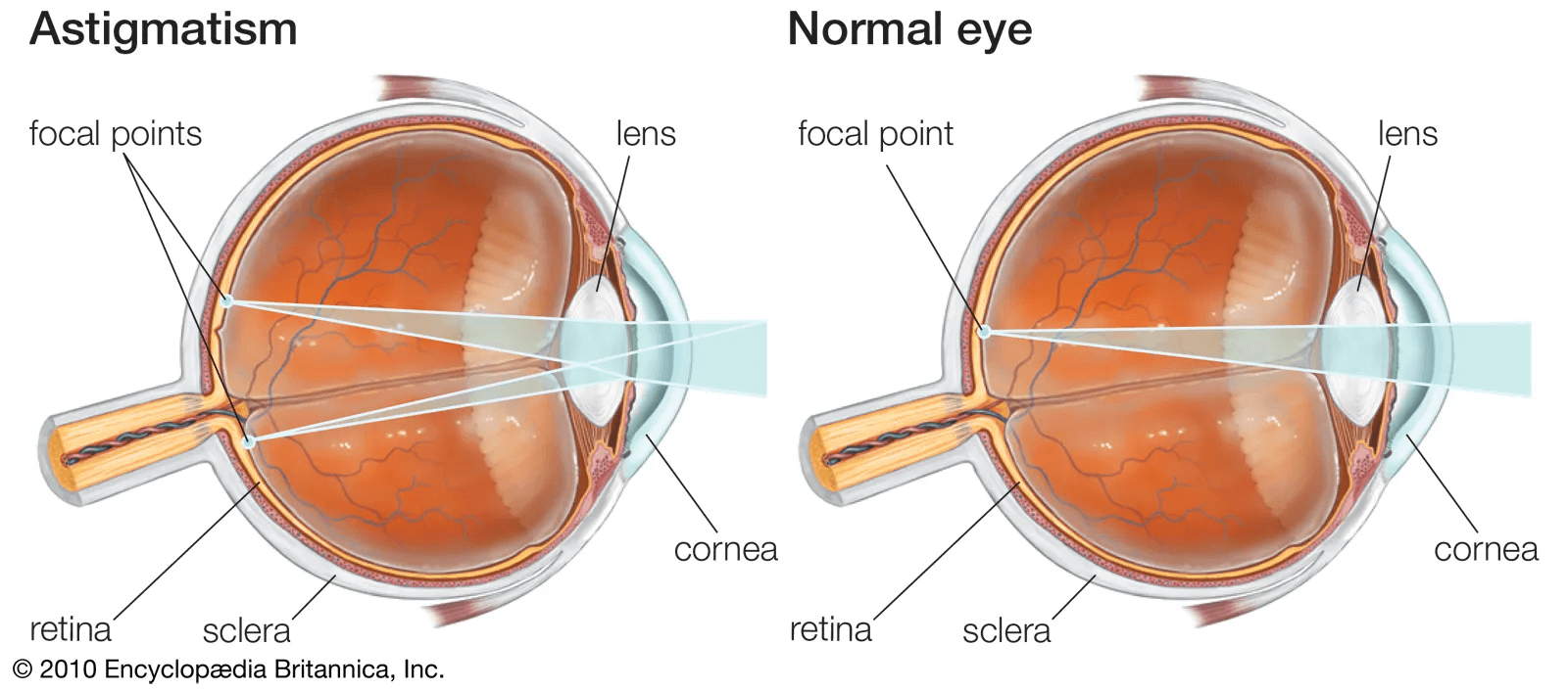 With astigmatism, the light will be refracted differently in one meridian than the other, causing the light and the focal point it reaches to be distorted. Light is evenly refracted across all of the eye's meridians in a healthy eye. An astigmatic cornea distorts light beams, producing focus spots in front of and/or behind the retina.